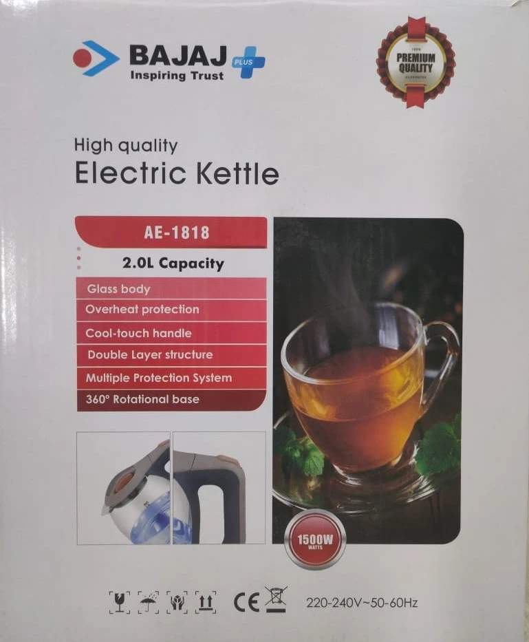 Bring elegance, efficiency, and safety to your kitchen with the Bajaj Plus High Quality Electric Glass Kettle AE-1818. Designed for modern households and offices, this premium electric kettle combines a stylish transparent glass body with powerful performance. Whether you are preparing tea, coffee, instant noodles, or hot water, this kettle ensures fast boiling with complete peace of mind.