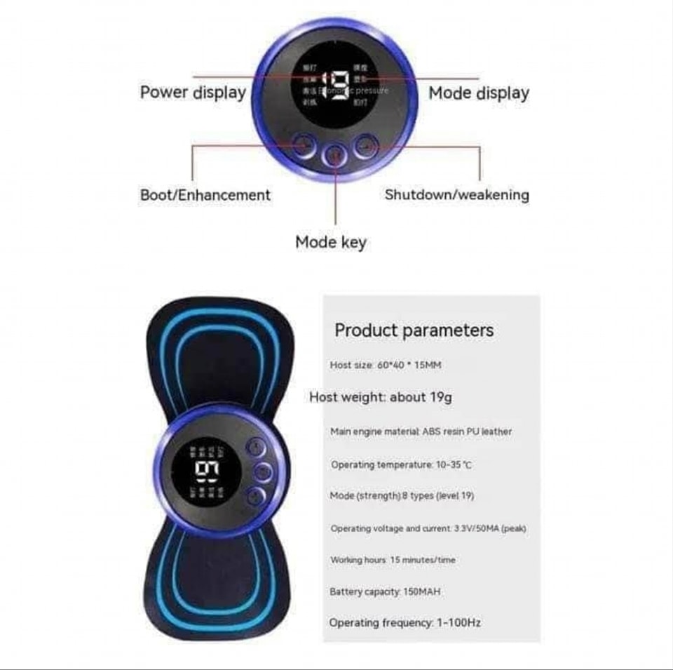 Equipped with 8 massage modes, 19 intensity levels, and multiple massage techniques including tapping, kneading, shiatsu, and pressure touch—this massager ensures a fully customized massage experience. The two soft gel pads comfortably attach to different parts of the body, allowing targeted relief for the neck, back, waist, arms, hips, or legs.
